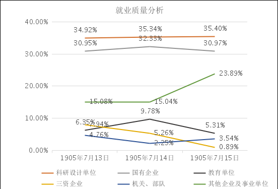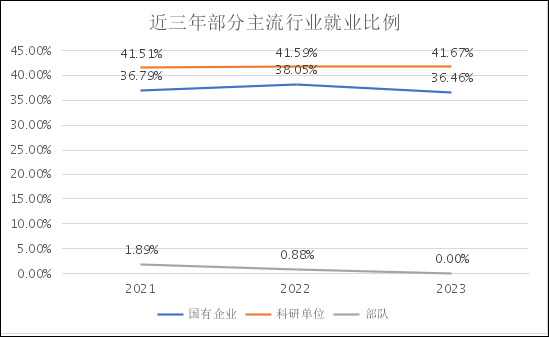 近三年(2021-2023年),365英国研究生的主流行业主要就业单位是国有企业和科研单位,各行业比例基本持平。